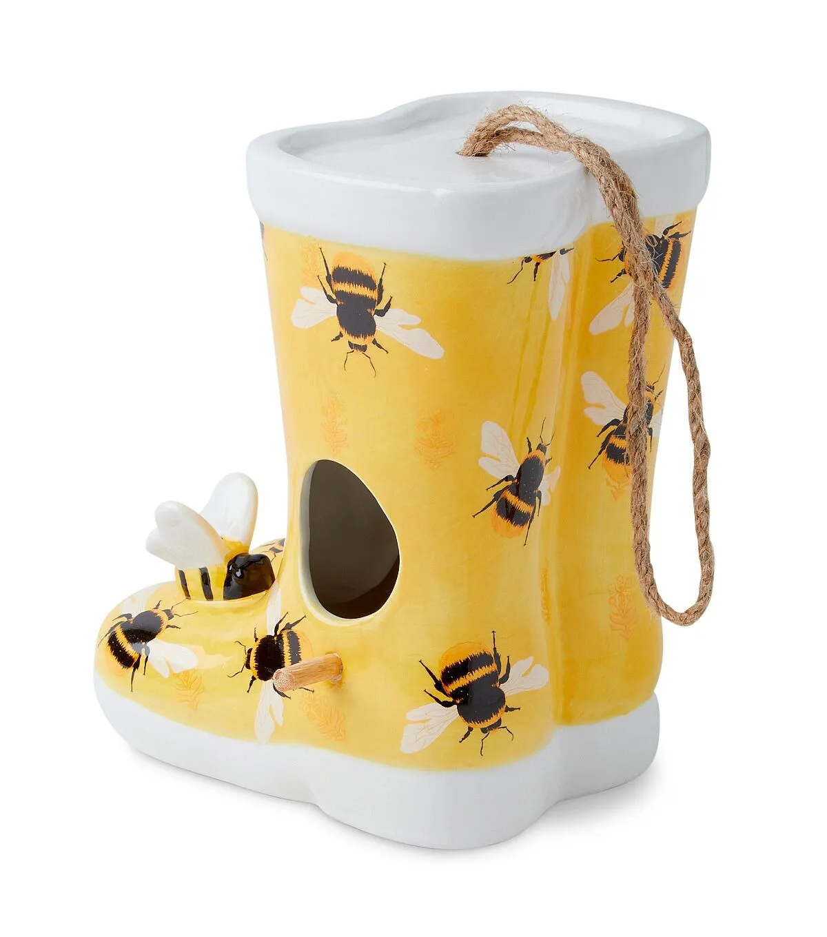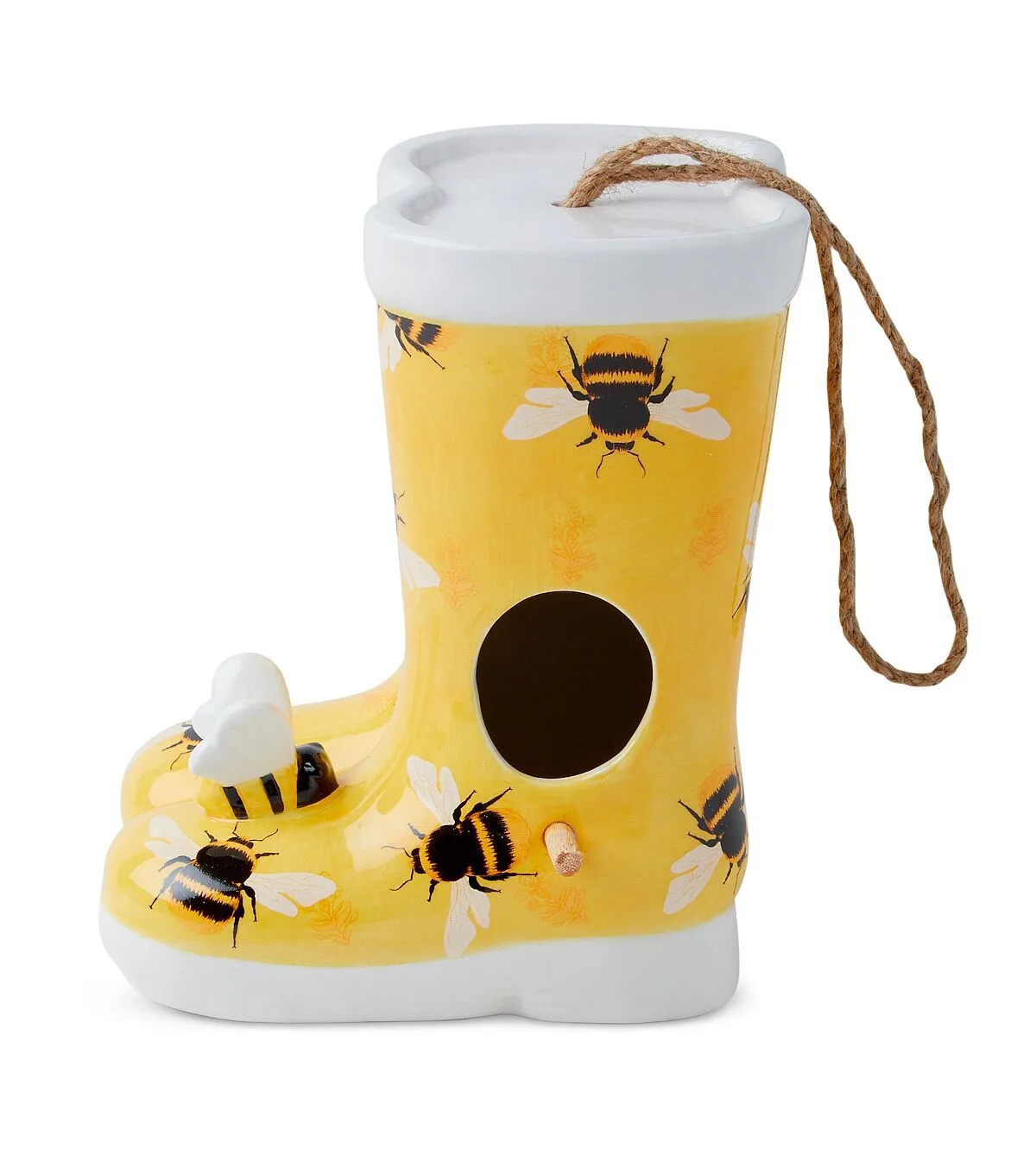 17" Spring Bees on Yellow Ceramic Rainboots Birdhouse by Place & Time