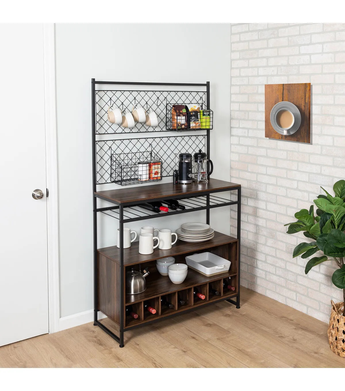 Honey Can Do 65" Black & Walnut Kitchen Bakers Rack With Wine Storage