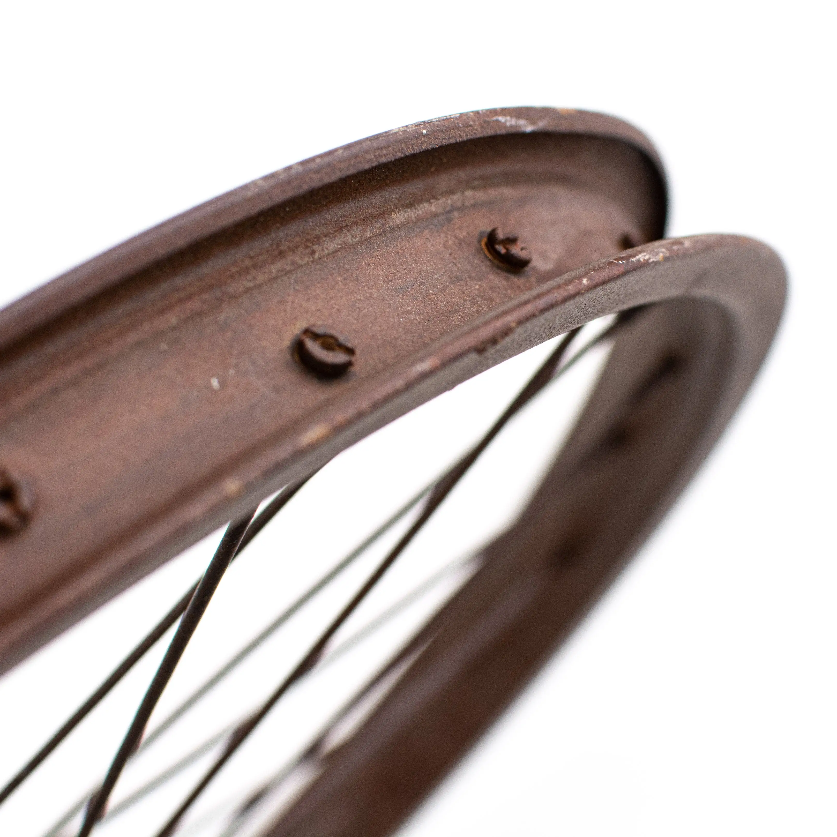 This rusty patina bike wheel is made of aluminum for a sturdy, but lightweight decoration. We like using these as bases for florals, especially paired with our bike ribbons. We've shown it with Christmas pine, but it works for all seasons.