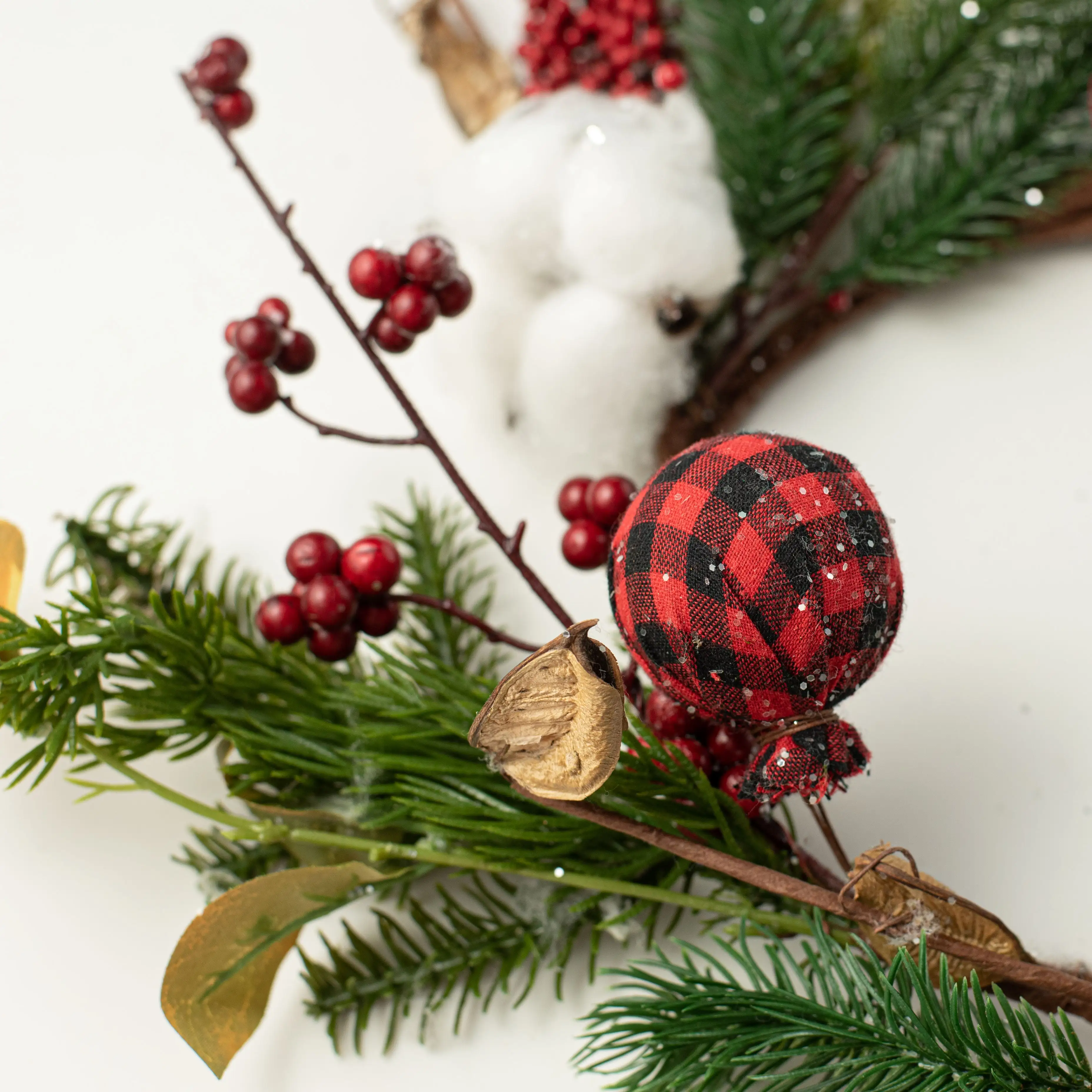 This small holiday wreath is appropriately sized for use on windows, shutters, and other narrow spaces, and doubles as a candle ring. Glittered cotton bolls, buffalo plaid fabric balls, and red berries are worked into two different types of pine as they stretch out from a central ring.