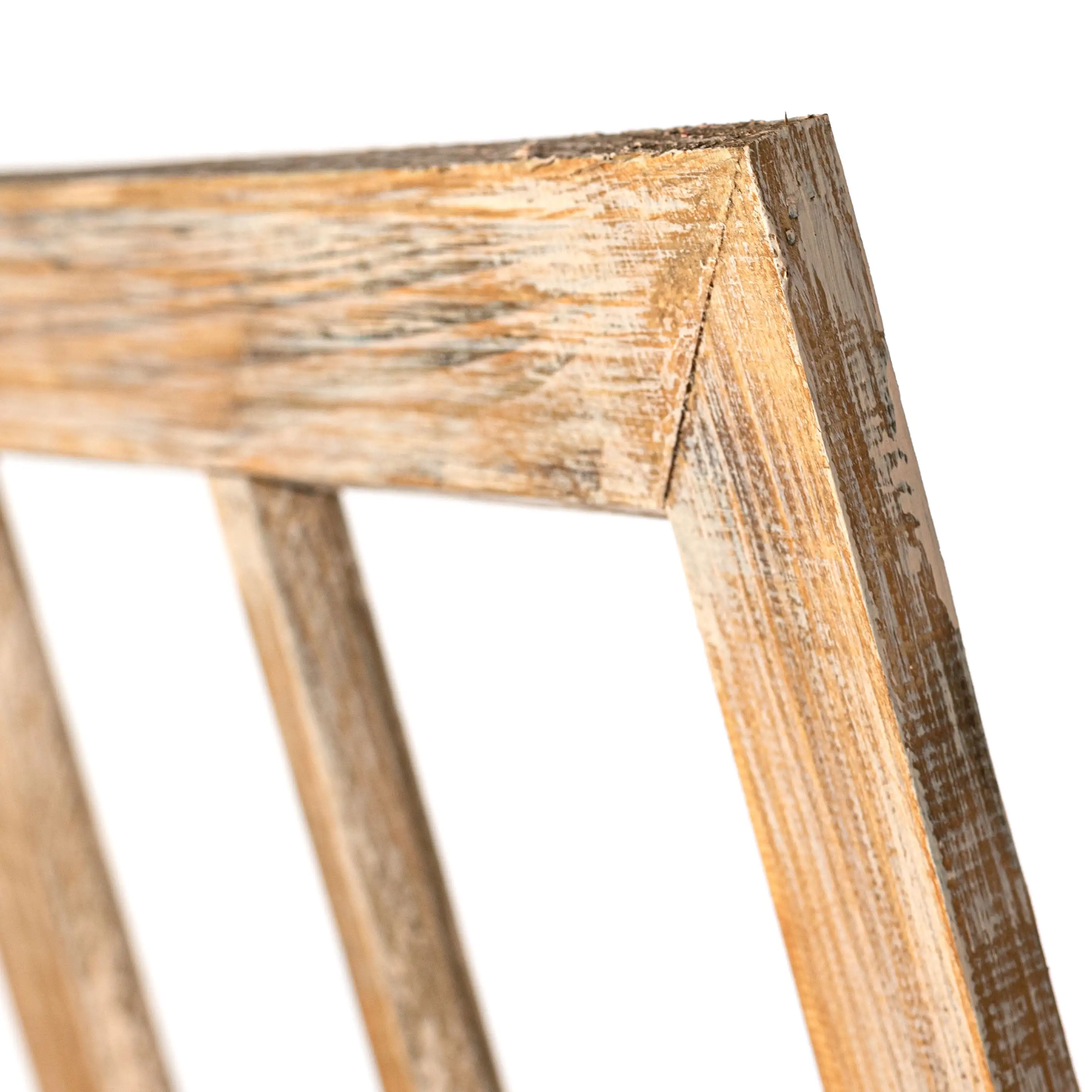 This faux window frame has four empty panes with an antique, farmhouse look. The beveled wood is brown with a wash of beige paint. It can be used as a base for florals, ribbons and small cabinet wreaths/candle rings.