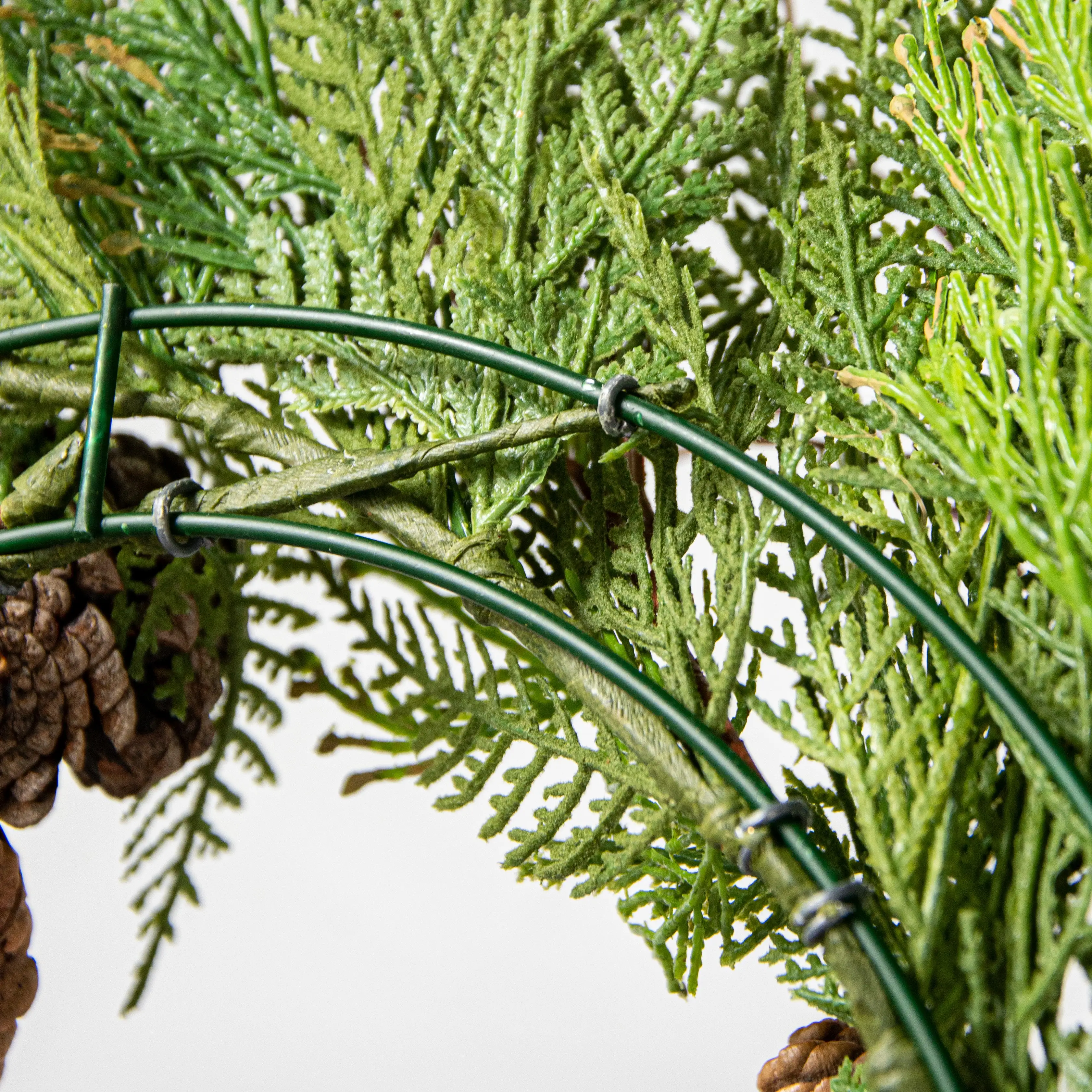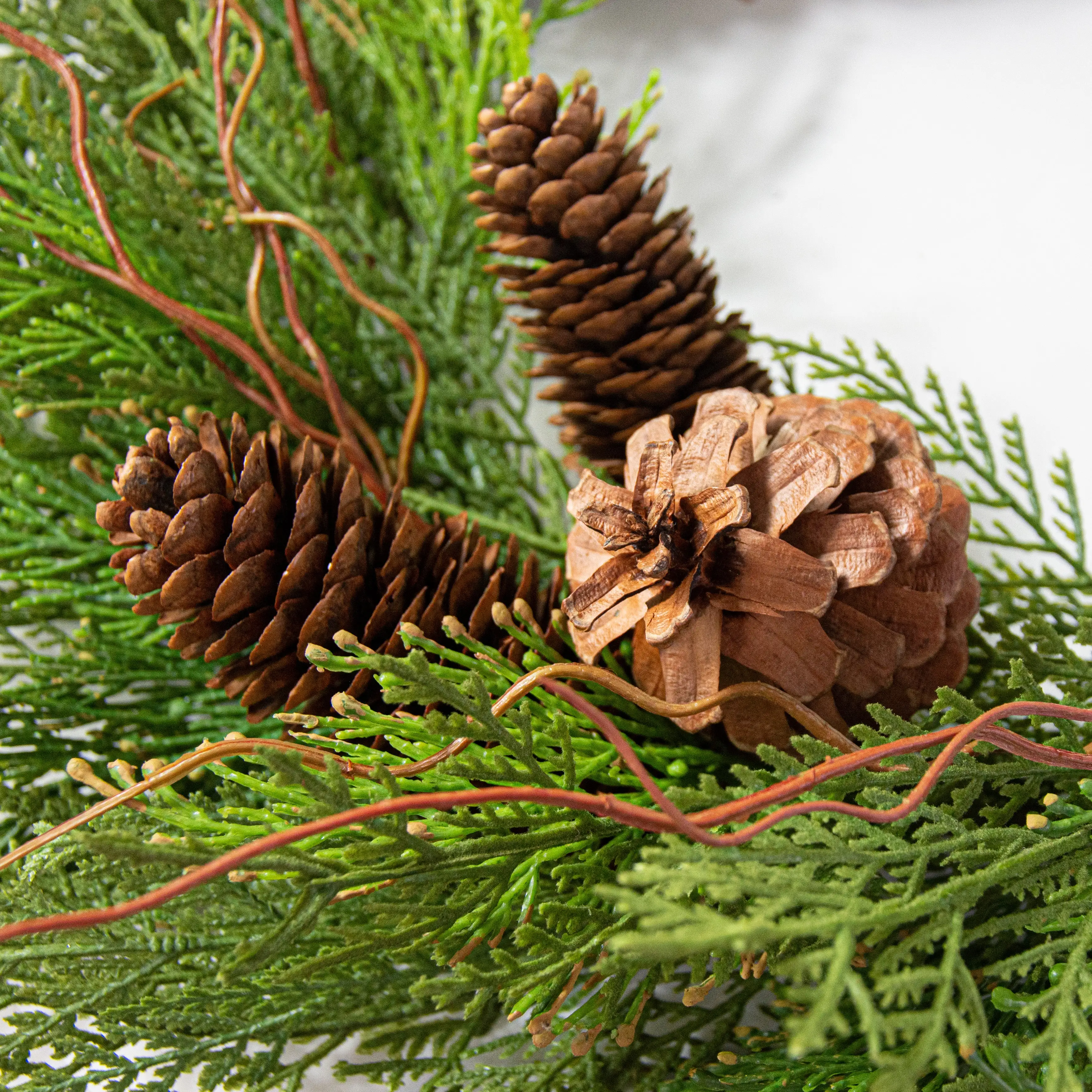 This feathery wreath mixes incense cedar pine in two shades of green, naked twigs and pinecones. Each piece of pine is wired along its spine for shaping. Use alone or add accents like our "5' Orange, Lemon, Cinnamon Garland" and "2.5" Linen Holly, Dried Fruits, Cinnamon Ribbon."