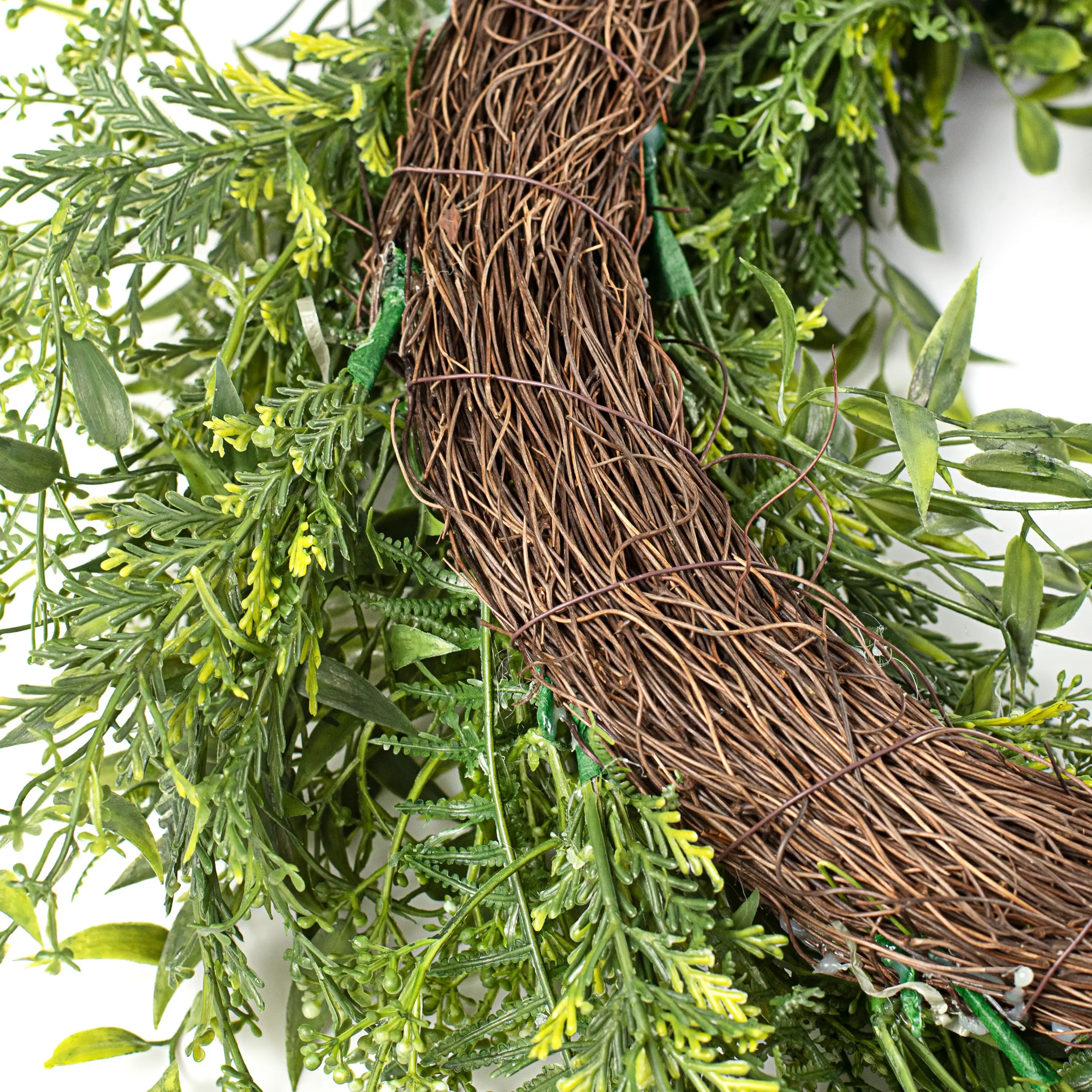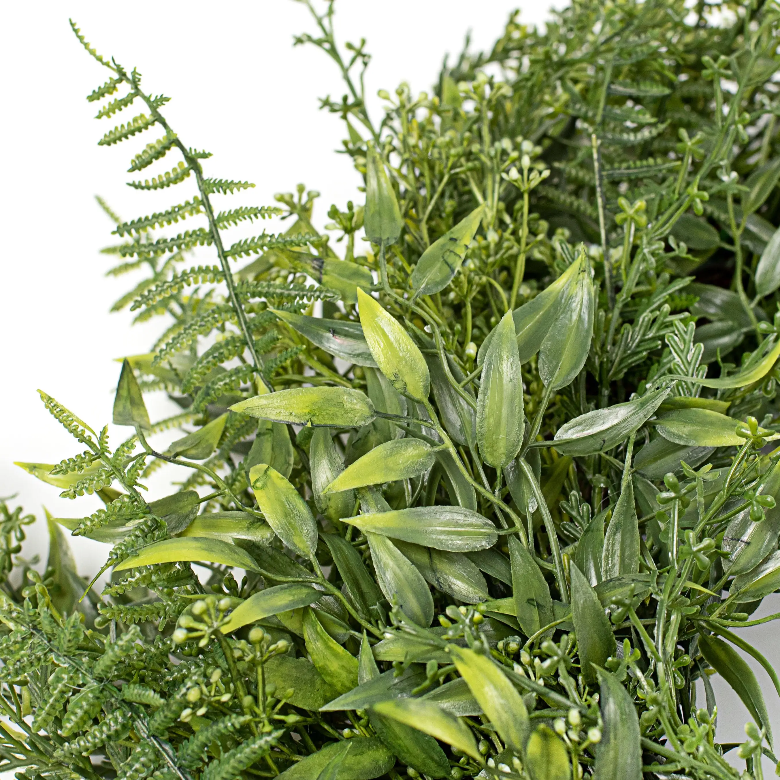 This wreath has a thick angel vine base topped with a mixture of plastic greenery. The broad leaf, vine, seeded and fern textures are balanced throughout. Lightly wired, the leafy sprigs can be lightly fluffed.