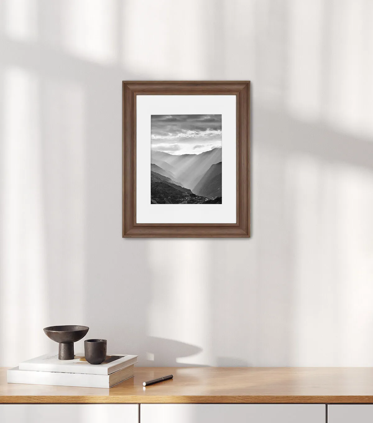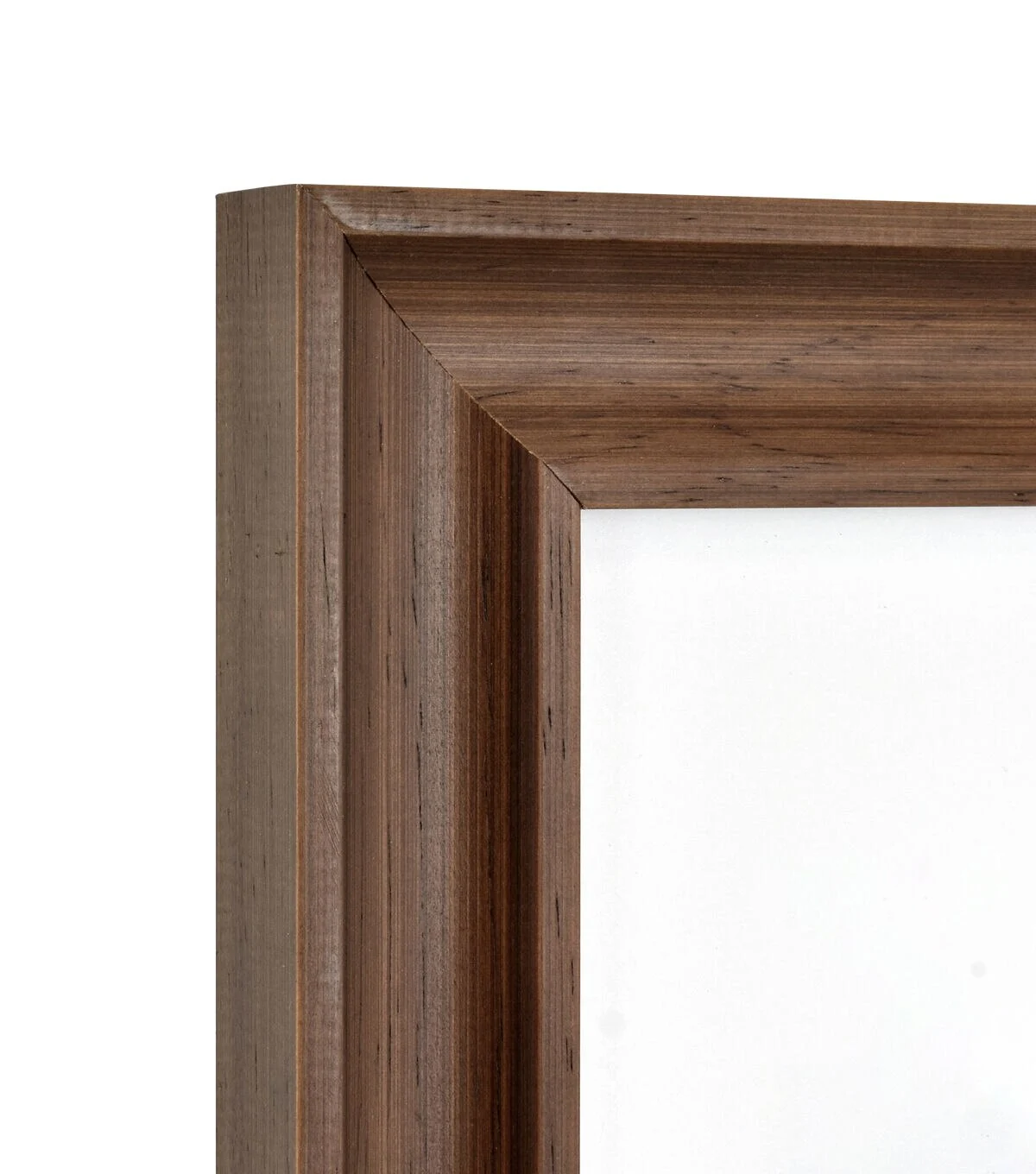 This stylish picture frame features a wide scoop profile in a walnut finish. The frame is constructed of sturdy MDF and features a white beveled mat. This frame holds one 8x10 inch photo displayed inside the mat opening or one 11x14 inch photo displayed without the mat. Its classic style is a great fit for any décor.