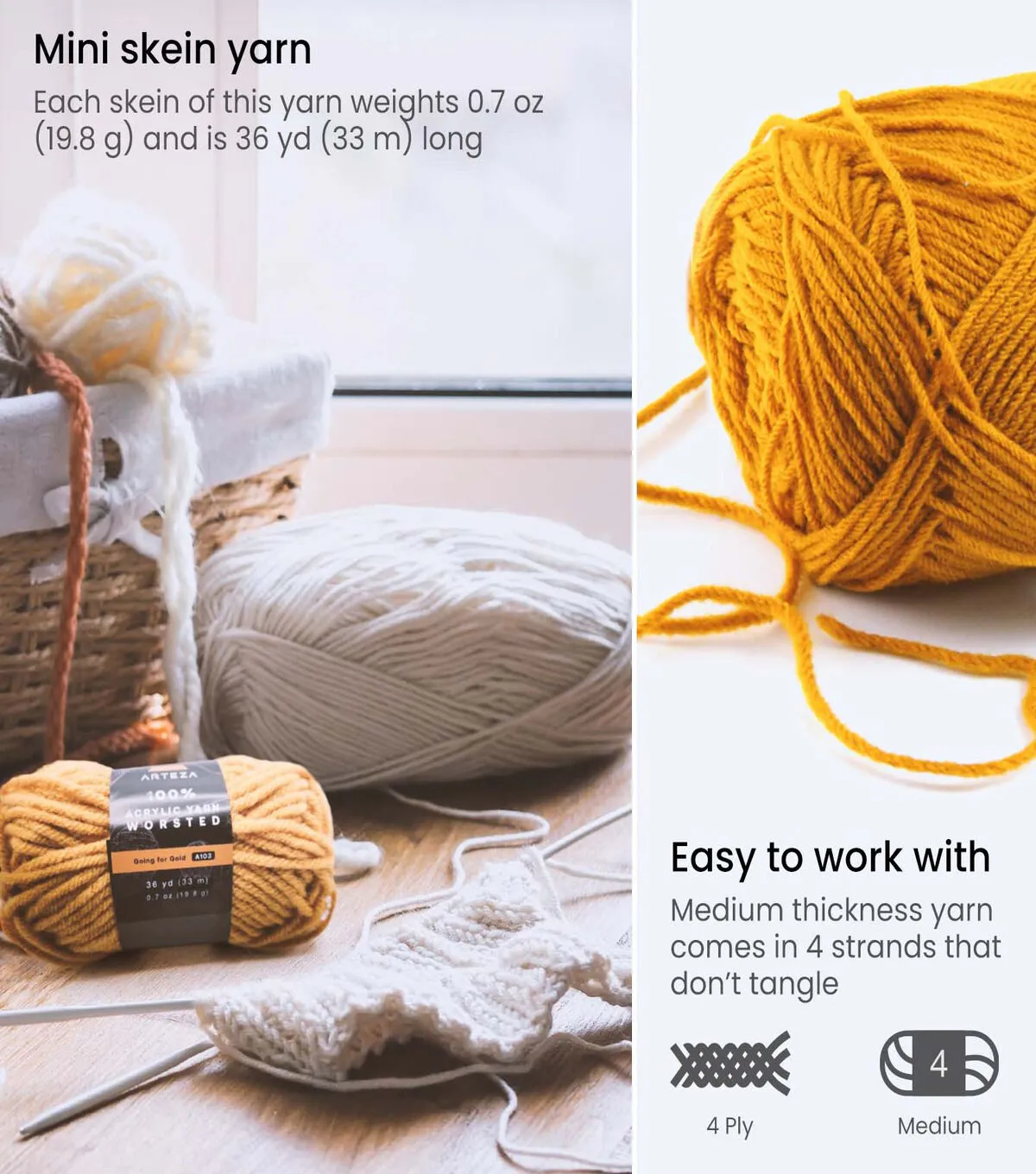 Design and knit the fabric crafts of your dreams with our 100% Acrylic Yarn Worsted Mini Packs - Classic Colors. The innovative set features a variety of 20 perfectly curated mini skeins (36 yd/ 33m each) for you to test color swatches and make smaller crafts like socks, mittens, amigurumi, and more. You’ll receive one ombre shade and a wide range of dark and light shades to create your next fabric masterpiece! Provide yourself a well-crafted fabric with our 100% Acrylic Yarn Worsted Mini Packs - Classic Colors. Worsted yarn is known for being an incredibly versatile, medium weight fabric that is perfect for a variety of knitting and crochet crafts. Additionally, this acrylic yarn is Oeko -Tex 100 Certified, meaning it is safe to use for baby clothing and sensitive skin.