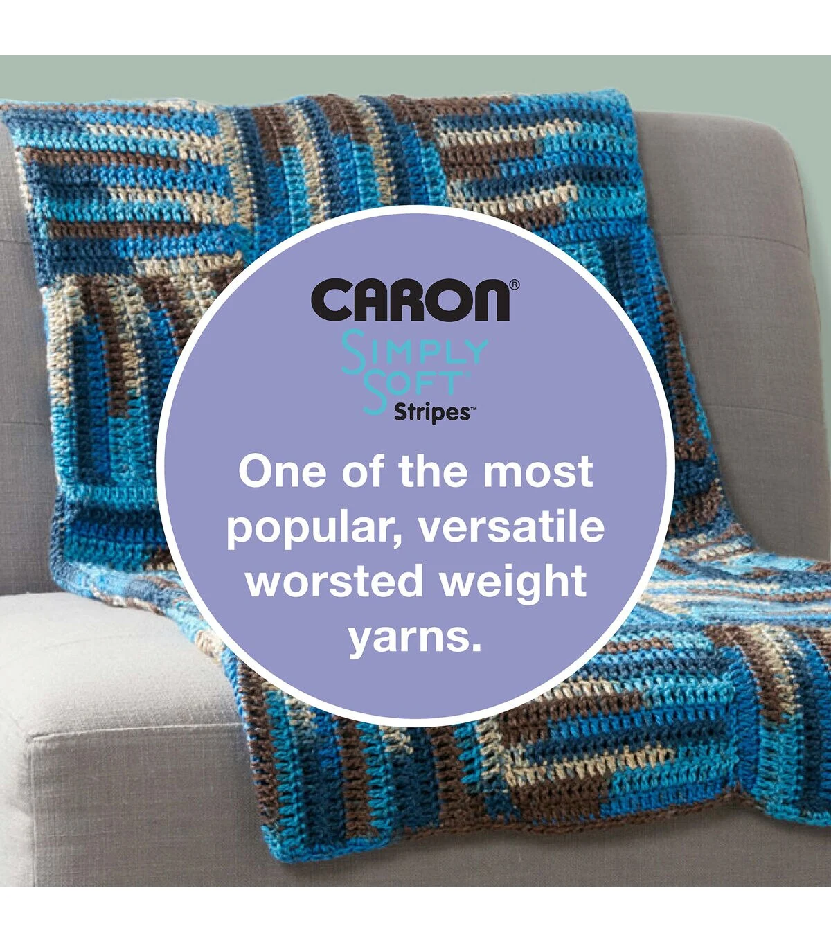 Caron Simply Soft Stripes is everything that you love about the original Caron Simply Soft, in a range of beautiful range of self-striping shades. Projects work up with a lustrous sheen, and with dimensional color that does all the striping work for you. Each colorway combines complimentary shades, creating unique knit and crochet projects. Conveniently machine washable and dryable, this worsted weight yarn is ideal for a variety of uses, from fashion to home decor.