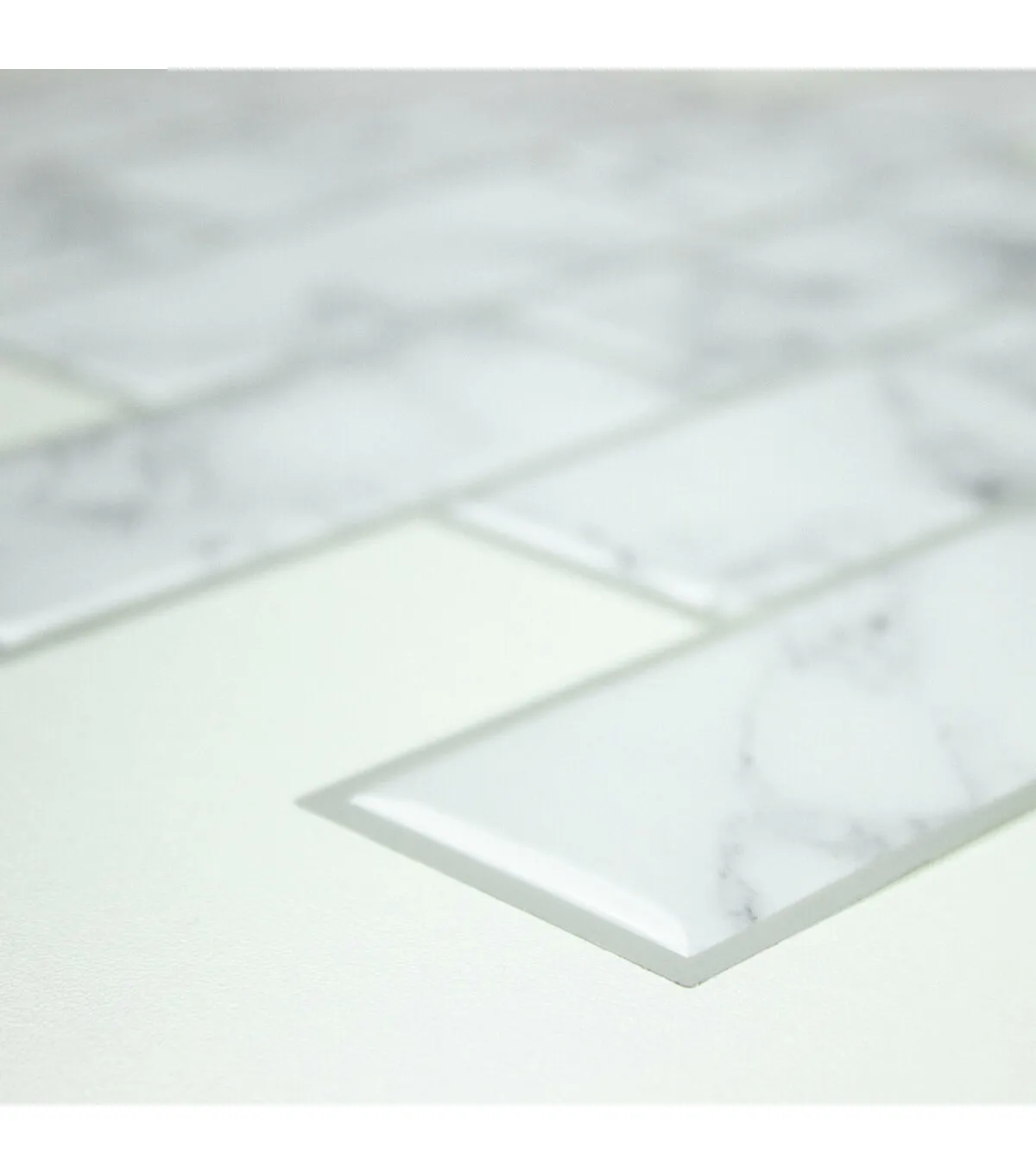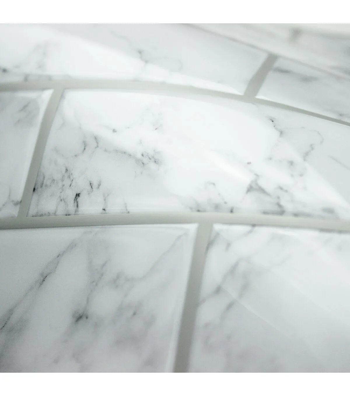Easily apply the elegance of Italian marble with RoomMates Carrara Marble StickTiles. Classic Carrara marble is a timeless design for any area in the home and this carefully crafted marble faux motif brings ageless beauty to kitchen backsplash, baths, or bar areas. White with flecks of grey to black, these StickTiles have a 3D glossy finish giving you the look and feel of genuine designer tiles. But unlike real tiles, you do not need heavy equipment (such as a wet saw) to cut them, nor do you need messy grout or additional paste. Simply use a utility knife or scissors to trim to size and work around difficult areas like corners or outlets… and just peel and stick! These tiles are the go-to solution for do-it-yourself easy and affordable new backsplash décor installed with regular household tools. RoomMates StickTiles help you decorate in minutes. 4 Tiles 10.5 inch x 10.5 inch 2.45 sq. ft