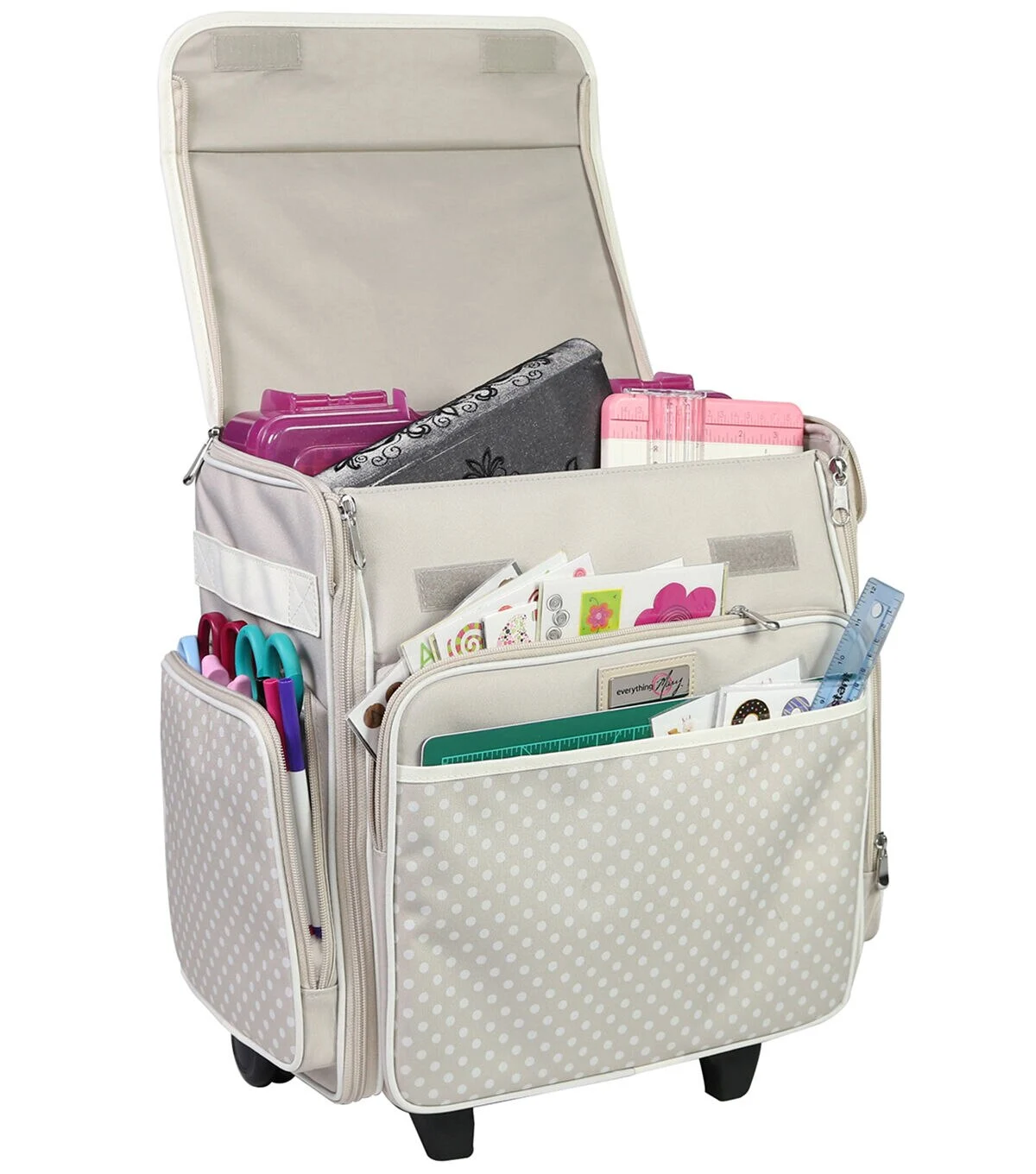 The Everything Mary Collapsible Rolling Craft Bag is the ultimate storage solution for any storage needs. This rolling organizer cart is constructed with durable polyester and features premium zippers, piping, and an Everything Mary emblem. Seventeen total storage spaces are built into this scrapbook storage case for all of your tools, sewing notions, or other supplies. The main compartment on this rolling craft organizer is perfect for scrapbooking IRIS boxes, paper, crafts, containers, and so much more! In addition, this scrapbook rolling tote features a telescoping locking handle and a durable wheelset for secure craft storage—the Everything Mary Collapsible Rolling Craft Bag was made with crafters in mind.