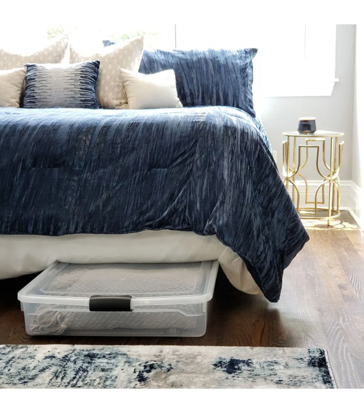 Keep your knickknacks organized with the Plastic Underbed Storage Container with Latching Handles - Clear & Gray. This durable plastic container is designed with large, gray ergonomic latching handles. You can use it to store holiday ornaments, clothes, small toys and more. It will fit under most full or queen beds.