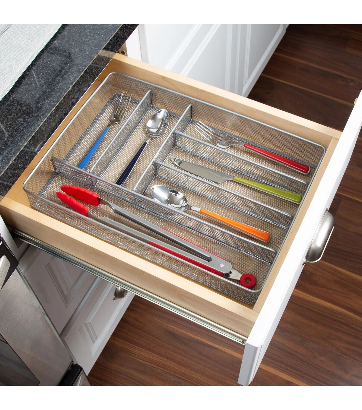 Your kitchen drawers can become quite disorganized, but not for long. This 6-compartment drawer organizer fits all your standard flatware neatly in its own place and still has room for larger items such as serving spoons, spatulas, and more. The mesh construction is easy to clean and the low 2-inch height profile makes it a great desk drawer organizer, too.