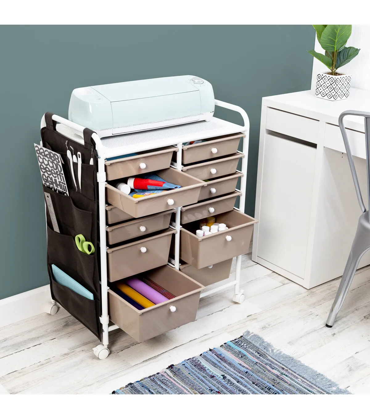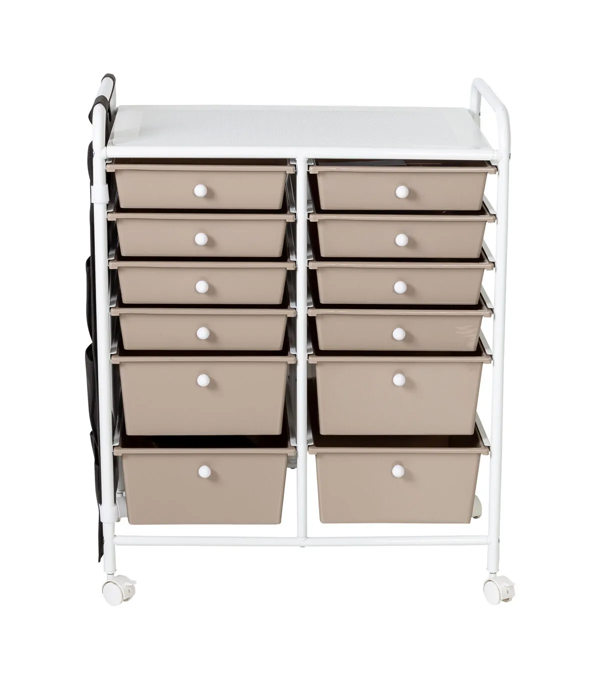 - Organize supplies across 8 small and 4 large beige drawers with white knobs