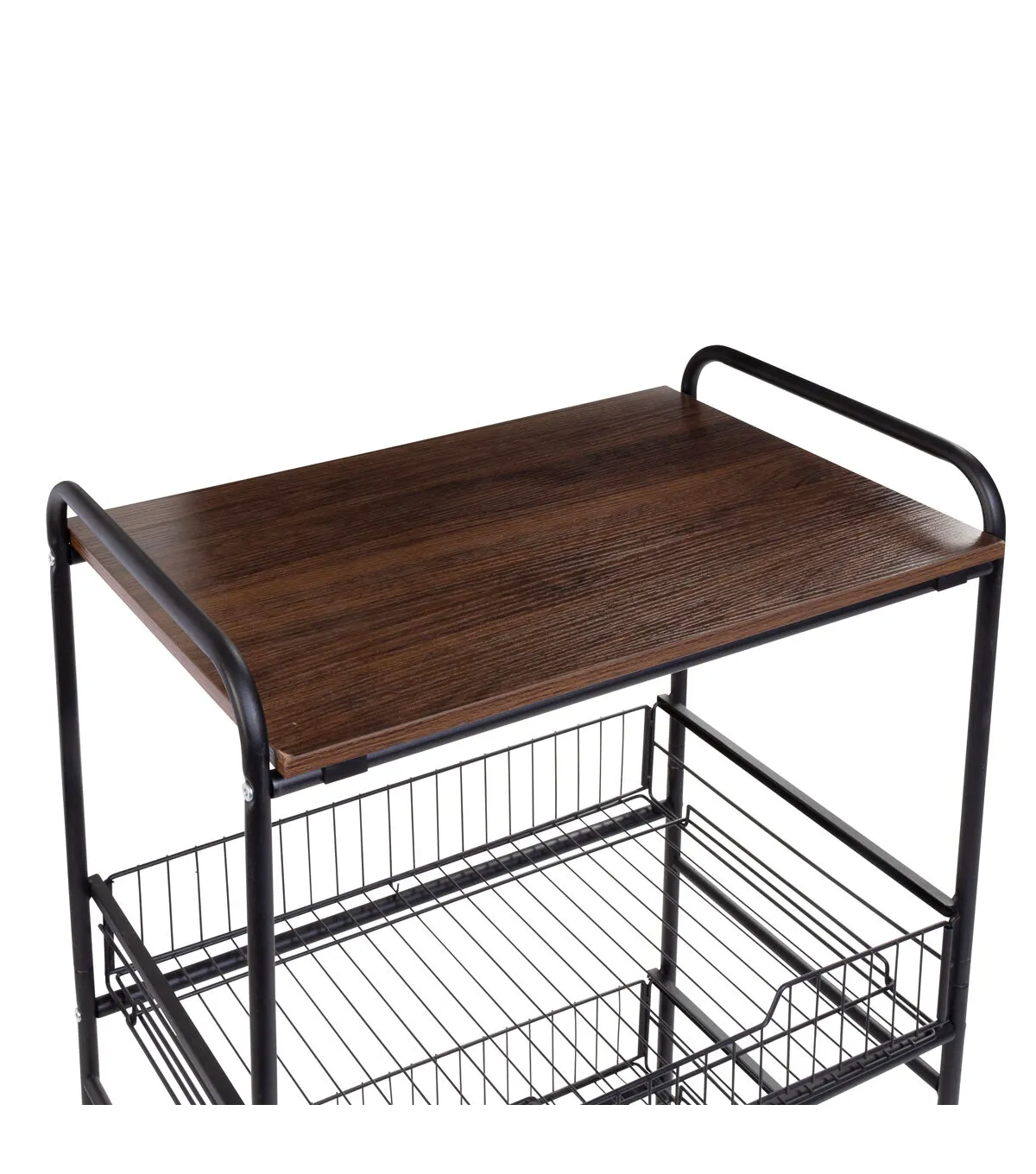 Whether used as a microwave stand or a farmhouse rolling cart, this 3-tier cart is crafted to organize your home in style! The top shelf finished in a warm natural tone can hold everything from plants to art supplies, while the pull-out baskets are ready to organize your clutter. The wire baskets will keep everything corralled while this cart is on the go. Once stationary, the open design and slide-out function allow you to see exactly what you have on hand and easily access it. Its simple wood and metal build offer a timeless feel that transcends trends, while its durability offers endless years of organization.
