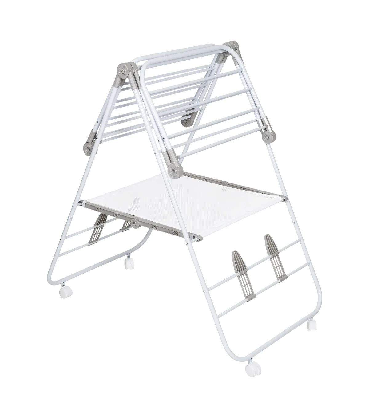 The only thing better than a large and versatile drying rack for clothes is one with wheels. A pair of wheels takes the portability of this wing drying rack soaring to new heights with their easy glide function that makes wheeling clothes from point A to B a breeze. Don’t worry; it still includes all the great features of the original Wing drying Rack with 42 linear feet of drying space that can hold 18 to 20 garments. The patented design also features smooth fold hinges that allow the wings to fold out into multiple positions for maximum drying space. It also boasts shoe racks that will keep your kicks in shape as they dry and a mesh shelf for those delicate pieces that need to be laid flat to dry. Once everything is ready to be folded, the A frame folds flat to 3” for easy storage.