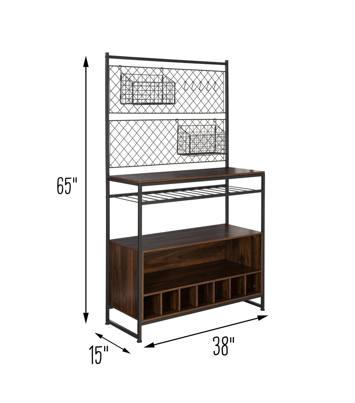 The perfect kitchen companion, this bakers rack will open up countertop and cabinet space and allow you to store large and small kitchen necessities all in one place. A row of wine bottle storage at the bottom of the rack is an added feature that holds 7 bottles of wine. Thinner shelf spaces are convenient for storing baking sheets and cutting boards, while standard shelves provide ample space for a microwave or a mixer. A wire grid backing with two baskets and five "S" hooks provides vertical storage space for holding spices or hanging spoons. This multi-funtional all-in-one bakers rack has a sturdy steel frame that will allow it to keep you company in the kitchen for years to come.
