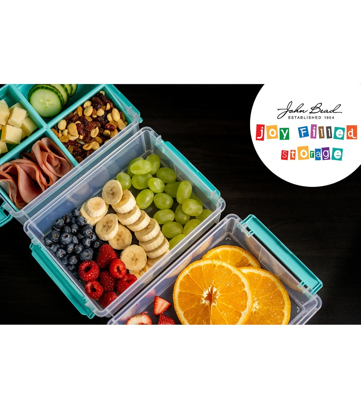 • The food grade containers can hold a large quantity, and variety of food with the separate compartments making party clean up smooth, quick, and easy. The pop of turquoise on the lids of these clear containers, as well as the aesthetically pleasing linear stacking of same sized containers will look excellent in the fridge or pantry.
