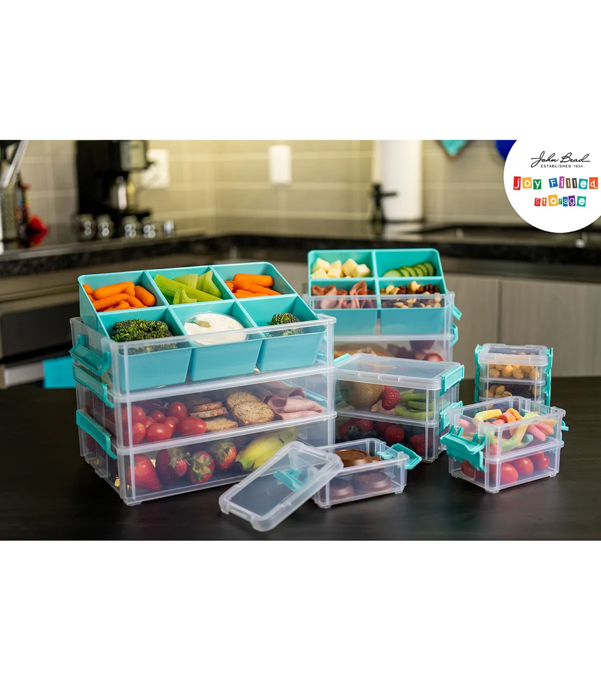 - The food grade containers can hold a large quantity, and variety of food with the separate compartments making party clean up smooth, quick, and easy. The pop of turquoise on the lids of these clear containers, as well as the aesthetically pleasing linear stacking of same sized containers will look excellent in the fridge or pantry.