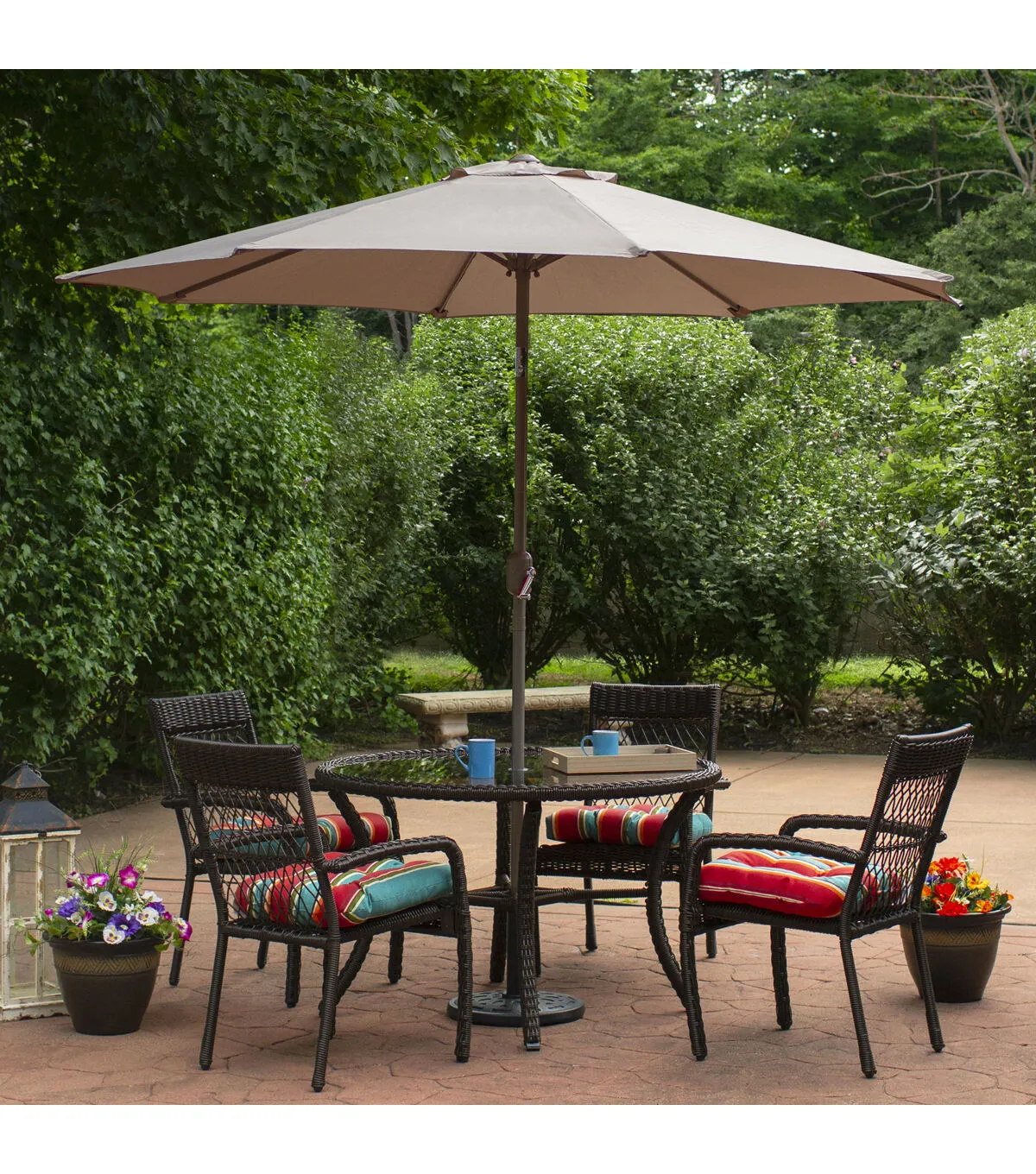 Stay shaded and cool this summer with our moderately sized market umbrella. Ideal for covering a 48-inch or four-person dining set. Features a sturdy powder-coated aluminum frame with steel ribs built to last a lifetime. The crank opening and push-button tilt mechanism allows for ease of use. Features: Umbrella shape: octagon Canopy color: taupe Frame and pole color: brown Diameter of open umbrella: 9' Height: 8' Pole diameter: 1.5" (38mm) Lift: hand crank Tilt: push-button tilt 8 ribs Material(s): 160 gram polyester canopy/powder-coated aluminum pole/steel ribs Note: Umbrella only base is not included