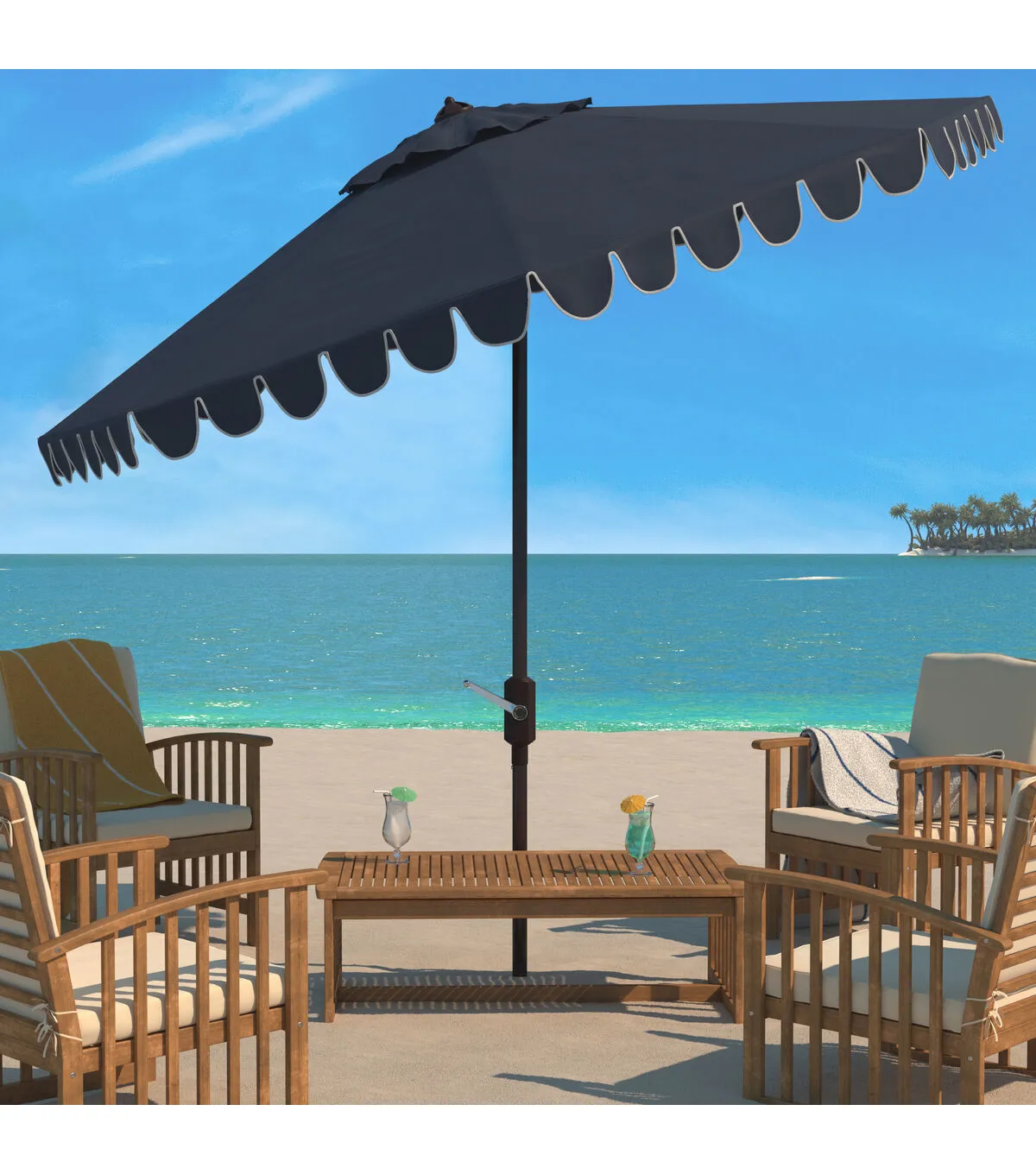 The signature white and blue coloration of Santorini��s lush legendary resort inspired this eleven foot crank umbrella. Its sophisticated navy hue features a scalloped white trim to create an outdoor retreat for the modern tastemaker.