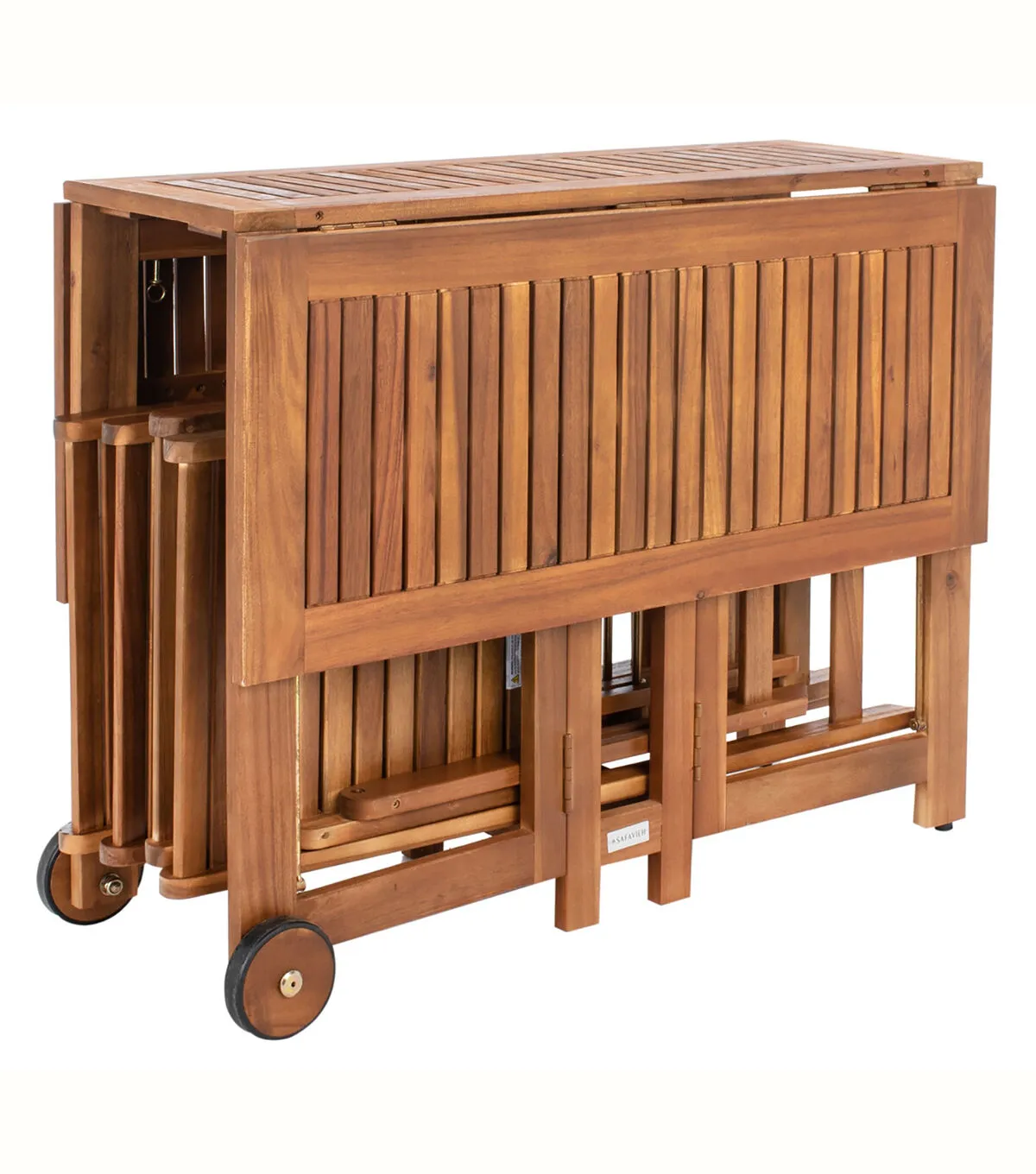 An ingenious space saver, Arvin outdoor dining table and chair set is designed for gracious outdoor living. Crafted of eco friendly acacia wood in natural, its 4 director style chairs fold and tuck under a foldable rectangular table for easy storage.