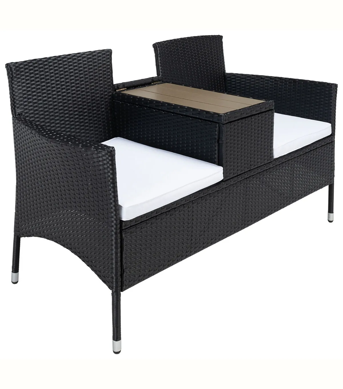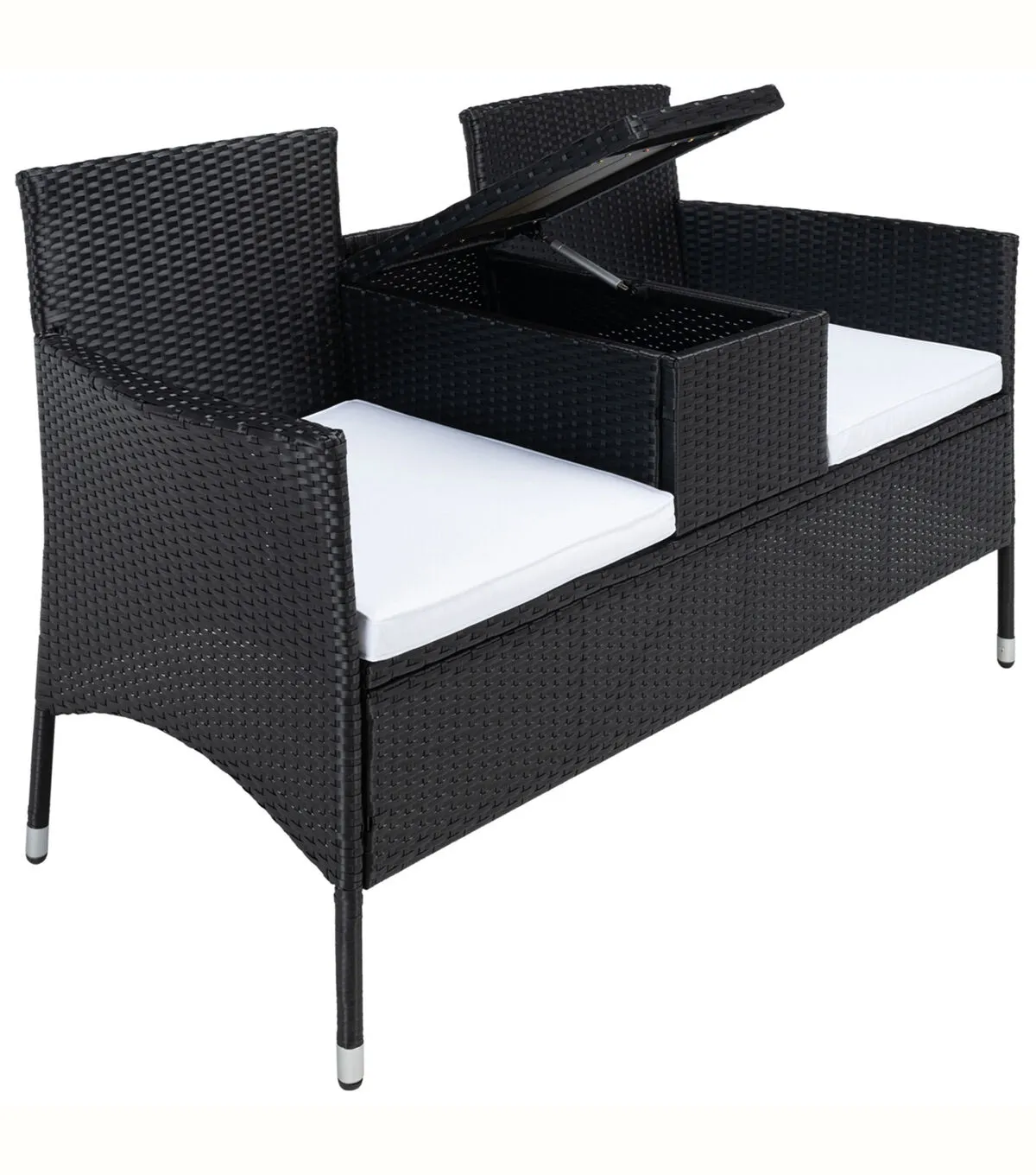 Form meets function for outdoor living in this Viora Loveseat. Viora��s subtle curves and clean lines are wonderfully highlighted by its modern black wicker details and plush white cushions, and a built in box with a gas lift provides discrete storage on the porch or patio.