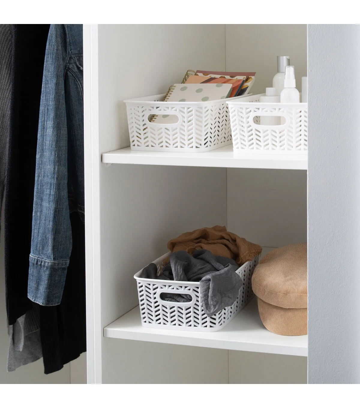Simplify's Herringbone Storage Bin has a unique wicker design and is made of sturdy polypropylene plastic. 2 sturdy open handles makes it easy to carry Bin around from one place to another. It has a lightweight design and holds a multitude of items, organizing and de-cluttering homes. Wide selection of colors to fit any setting.