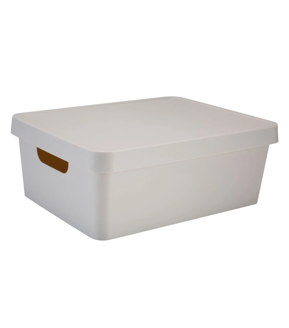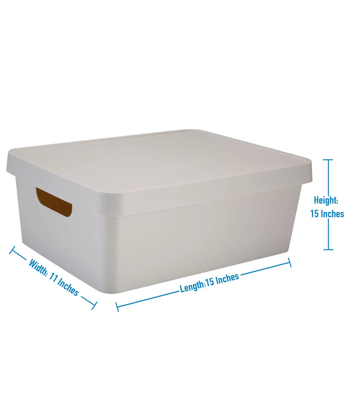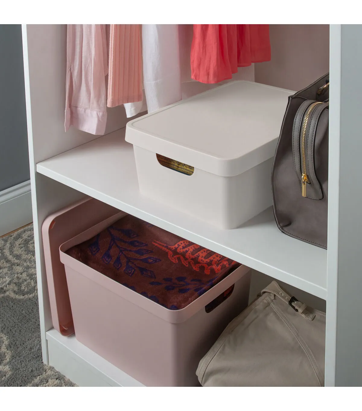 Keep any space organized with the Simplify Vinto storage boxes. The nestable and stackable design makes it convenient to store items in a sufficient space saving way. The click tight lid protects items from dust and odors and open handles makes the box easy to transport. The vinto storage boxes are perfect for toys, shoes, linens, seasonal, decor and more!