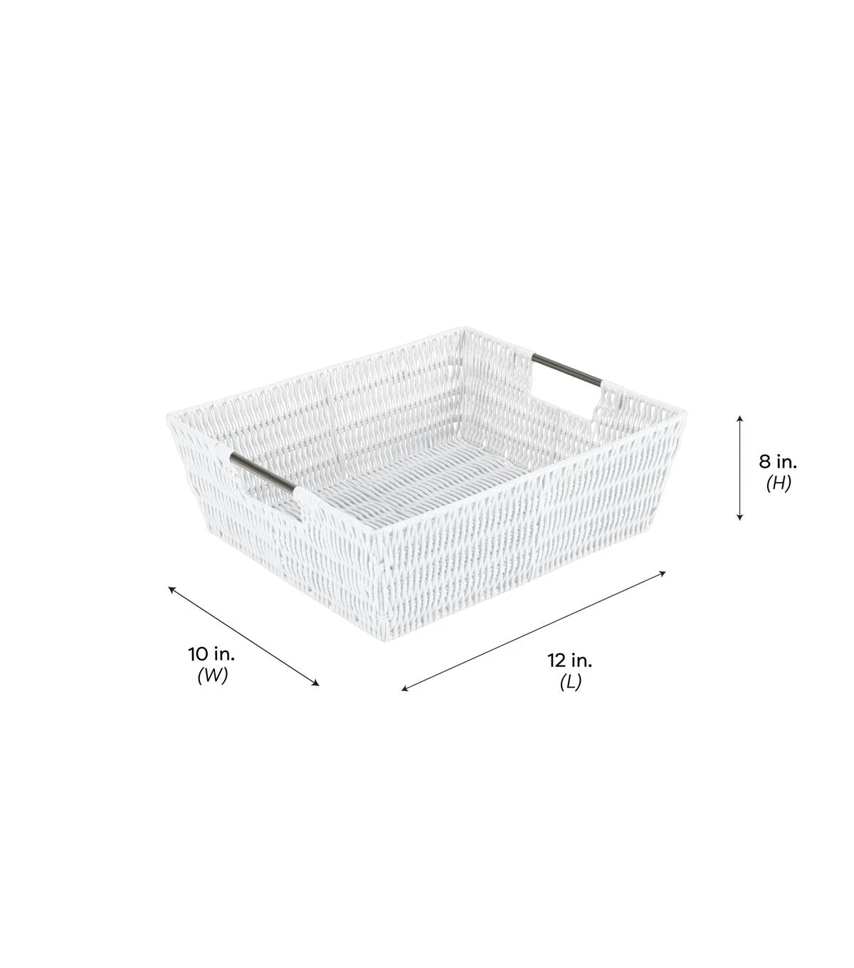Organize and create storage in your home with the Simplify Rattan Tote Basket Collection. Simplify's Rattan Tote is a PE Basket with an iron frame and 2 sturdy stainless steel carry handles. It is strong and durable prolonging it's life, and it's lightweight design makes it easy to lift and carry. Fits any home decor with it's wide selection of colors. Store your household belongings and organize space with these stylish baskets. Stack them together in a corner of your craft area, home office or Dorm to keep your essentials close at hand in an organized manner.