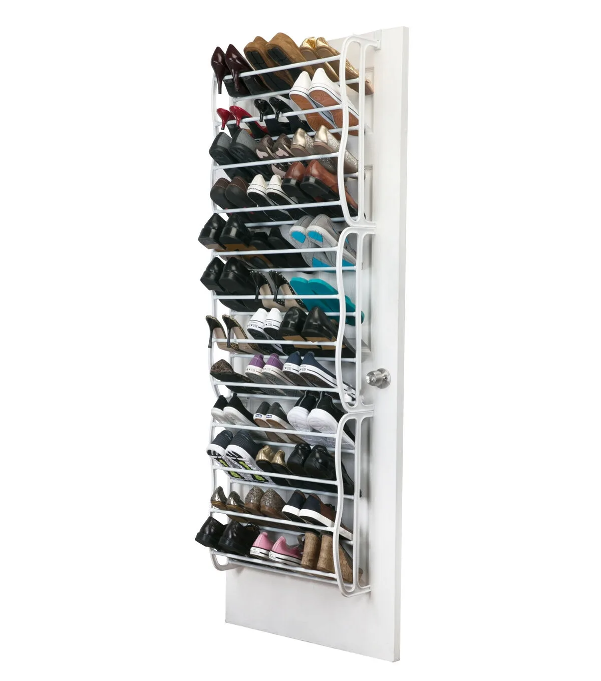 The Simplify 36 Pair Adjustable Over the Door Shoe Rack grows with your shoe collection. The adjustable shoe rack can grow from one, two or three tiers depending on how many shoes it's needed for. Each tier holds up to 12 pairs of shoes holding a total of 36 pairs of shoes. Without any tools the shoe rack mounts easily over most doors. Maximize your space in any room in the house!